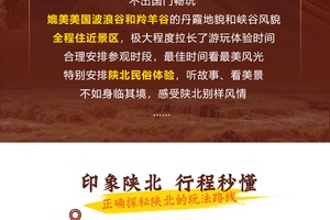 适时离开,前往榆林靖边的【波浪谷】,这里和美国亚利桑那州波浪谷齐名,处于同一纬度,虽然规模没那么大,但壮观的景象一点都不亚于美国波浪谷。靖边波浪谷目前仍处于半开发状态,景色比较原生态,红色砂岩历经风雨剥蚀呈现出千奇百怪的姿态和色彩,不同角度、时间都会呈现不同的景色,尤其是下一场小雨,被雨水浸润的红砂岩看上去更加细腻和五彩缤纷,美的更加富有层次,视觉冲击超强,是摄影大咖们的最爱。傍晚时分,我们去往波浪谷景区最值得称奇的【水上丹霞】【未开发区域交通费自理】,感受夕阳、红砂岩、碧水与蓝天的交相辉映,这种别样的美,会让你惊叹在黄土高坡上竟有如此温柔的景致,仿佛塞上江南。此刻我们可以跟着陕北老乡,哼一曲悠扬的信天游,将自己深深融入此情此景之中。