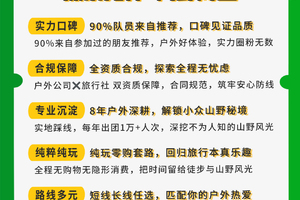 6.严禁擅自冒险行动、离队,私自行动,遵循“两人同行”原则,任何情况下必须两人结伴同行,安全是户外活动第一准则!!不听领队/导游指挥、擅自离队所发生后果由参与者自行承担;