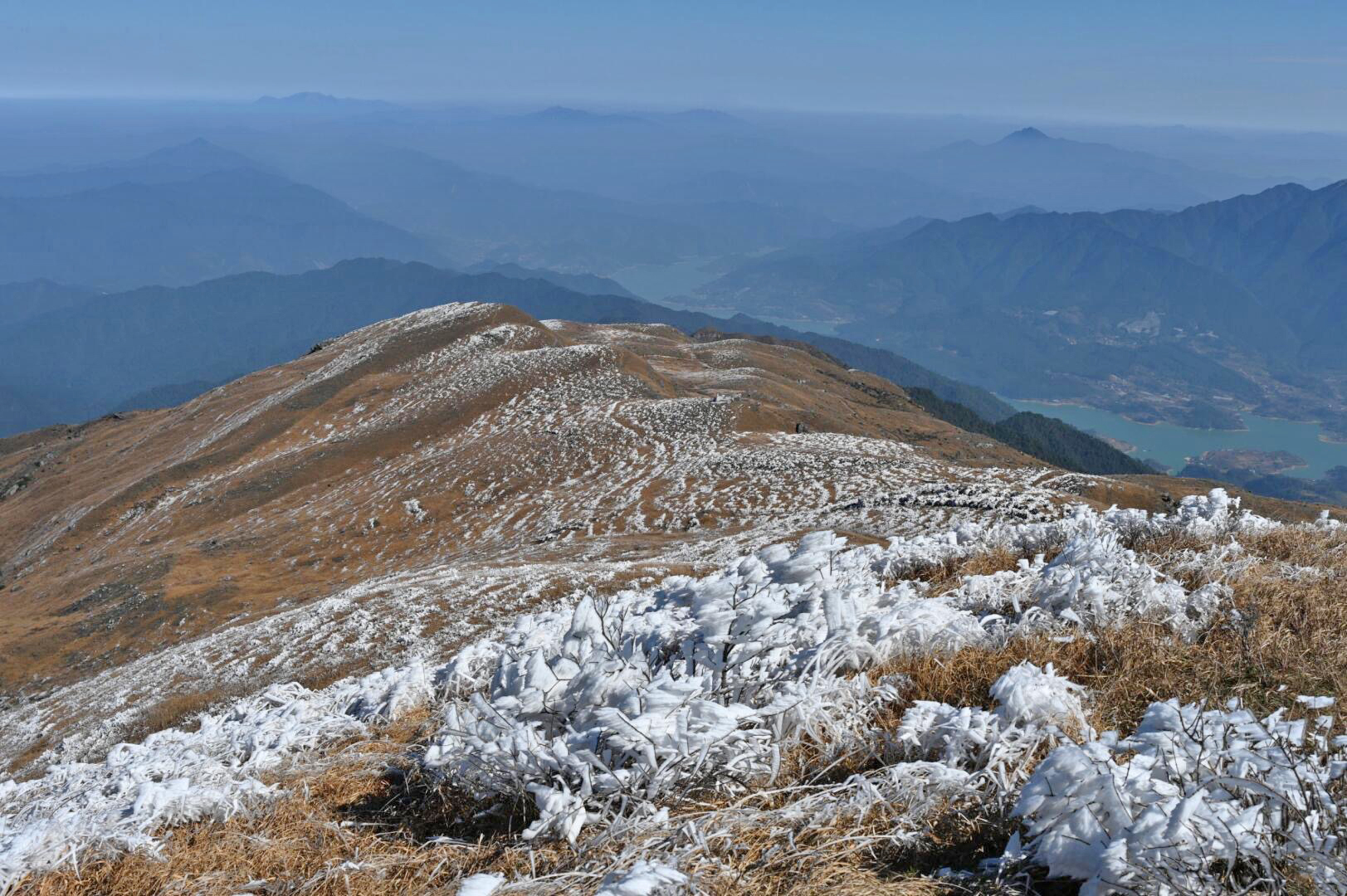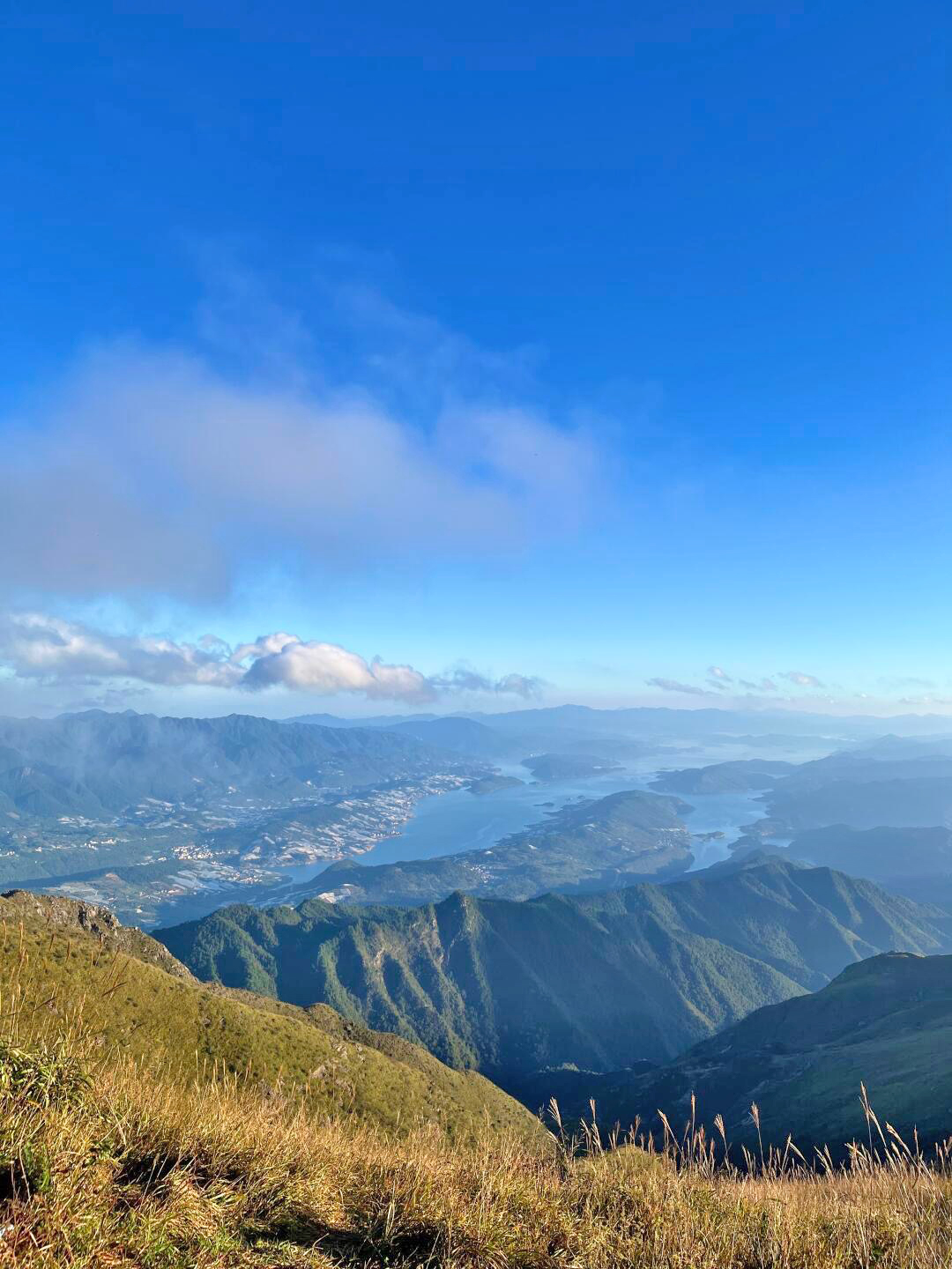 冲顶的瞬间,最是治愈。迎着天边渐亮的微光向上,脚下草甸愈发辽阔,踏上主峰的那一刻,所有疲惫尽数消散。这里是绝佳全景打卡点,立于山巅,湘南群峰壮阔景致一览无余:一侧东江湖烟波浩渺,晨雾缭绕间,碧波似碧玉嵌在群山,渔船点点灵动十足;另一侧峰峦连绵叠嶂,尽显磅礴气势。