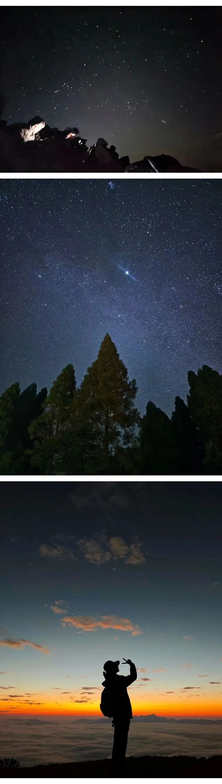 夜爬启程,便一头扎进幽深原始森林。落叶碎石铺就的野径,踩上去簌簌作响,在夜色里格外清晰。参天古树枝桠交错,将漫天星河剪成细碎光斑;同行者的头灯连成流动光河,与头顶星辰相映成趣。耳畔无半点城市喧嚣,只有虫鸣蛙叫、风穿枝叶的声响,越往上走,草木清香混着山间水汽扑面而来,沁人心脾。