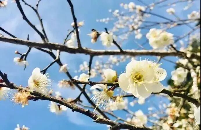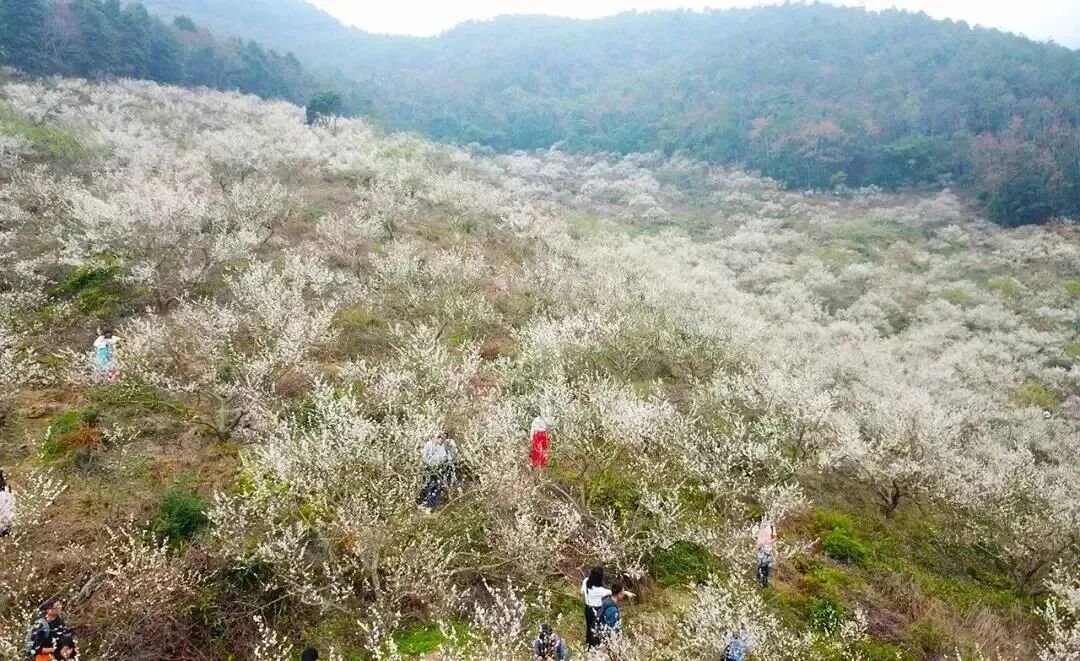 如今,这漫山遍野的梅树已渐入佳境。从远处看,梅花似一片雪海,风吹飘香。从近处看,花儿争艳,蜂儿翻飞,如诗如画,非常适合到这里写生、摄影甚至拍婚纱照。