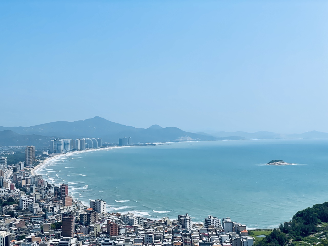 站在观景台,可以看见双月湾全景,左右两个半月,一个是风平浪静,一个是波涛汹涌,挺奇特的风景,远处青山连绵,近处是宽阔的海湾,风景尽收眼底。